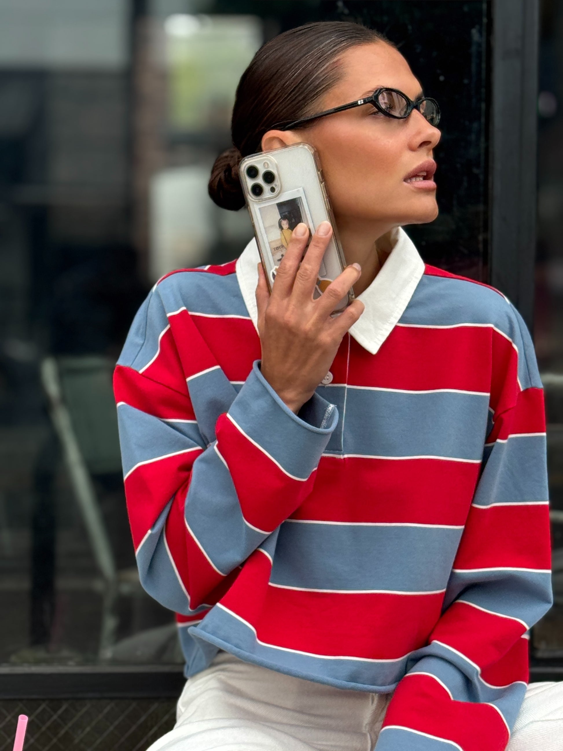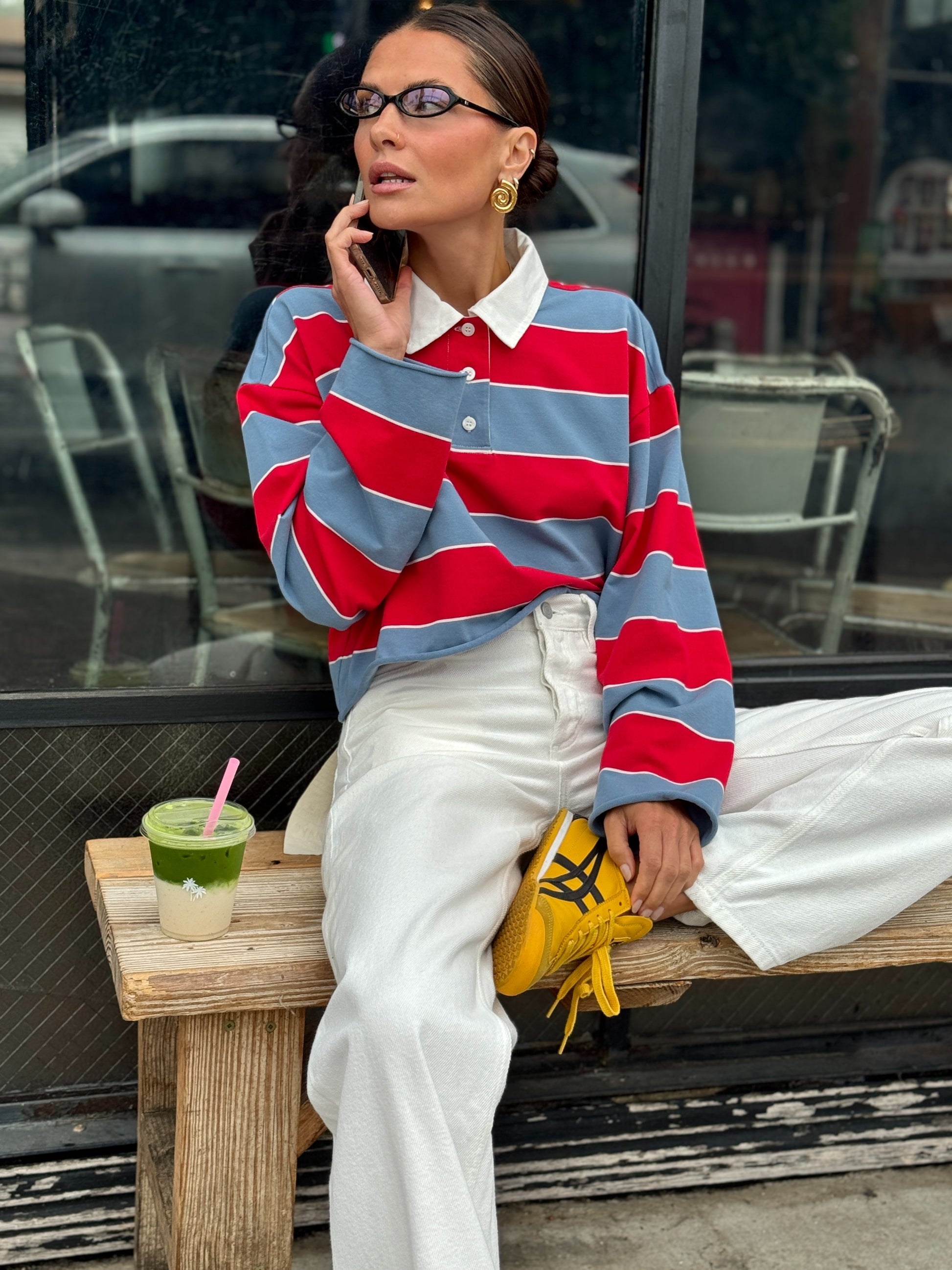 This rugby-inspired polo plays with proportion—cropped, relaxed through the shoulders, and finished with a bold stripe that leans classic but never predictable.